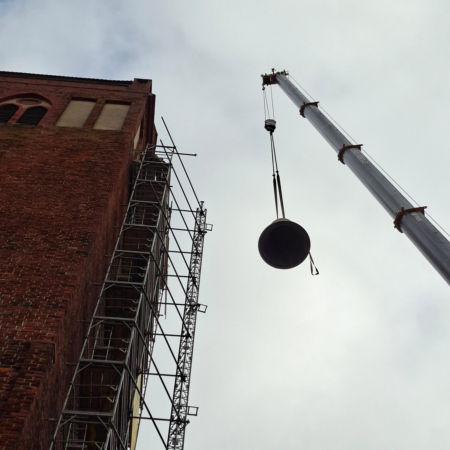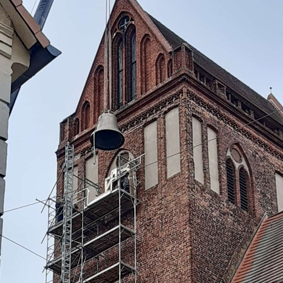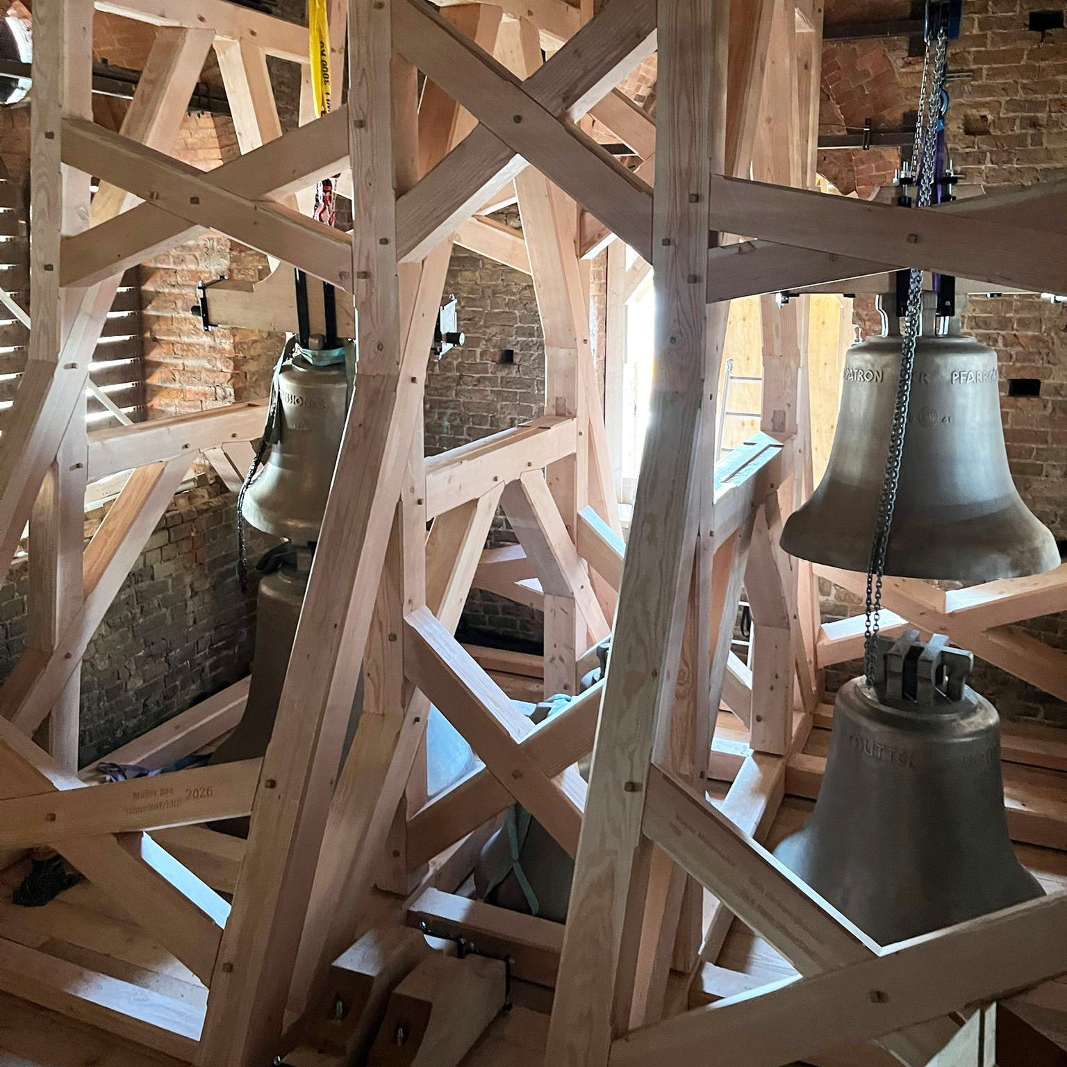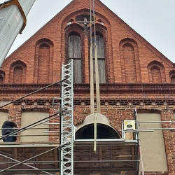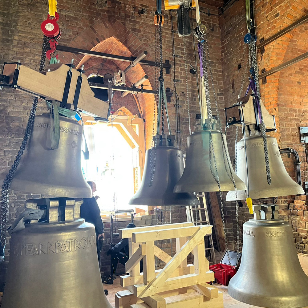 Nun ist es in den Turm eingebracht, das neue Bronzegeläut für die St. Jacobi-Kirche Perleberg! Sechs Glocken mit einem Gesamtgewicht von 8,32 Tonnen haben per Kran die neue Glockenebene auf 37 m Höhe erreicht. Dort wird nun der neue Glockenstuhl um die Glocken herum eingebaut, der von der Firma Müller aus Thalheim bereits vorbereitet wurde. Zugrunde liegt die Tragwerksplanung des Ingenieurbüros Kempe aus Dresden. Firma Walter Glockenläuteanlagen und Turmuhren KG aus Luckau schließlich übernimmt die Montage und Steuerung des Geläuts.
